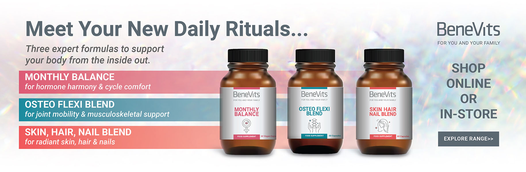 At Molloys we don’t just provide essential pharmacy dispensing and medicinal services, we also believe that pharmacy can play a huge role in nutritional health, general well-being and lifestyle. This is why we have used our knowledge and expertise to develop our own range of nutritional supplements Benevits & NutriSci to help customers achieve their personal goals. This gives you our customer more choice in addition to a wide range of market leading and locally sourced health, complimentary and sports vitamins we stock.